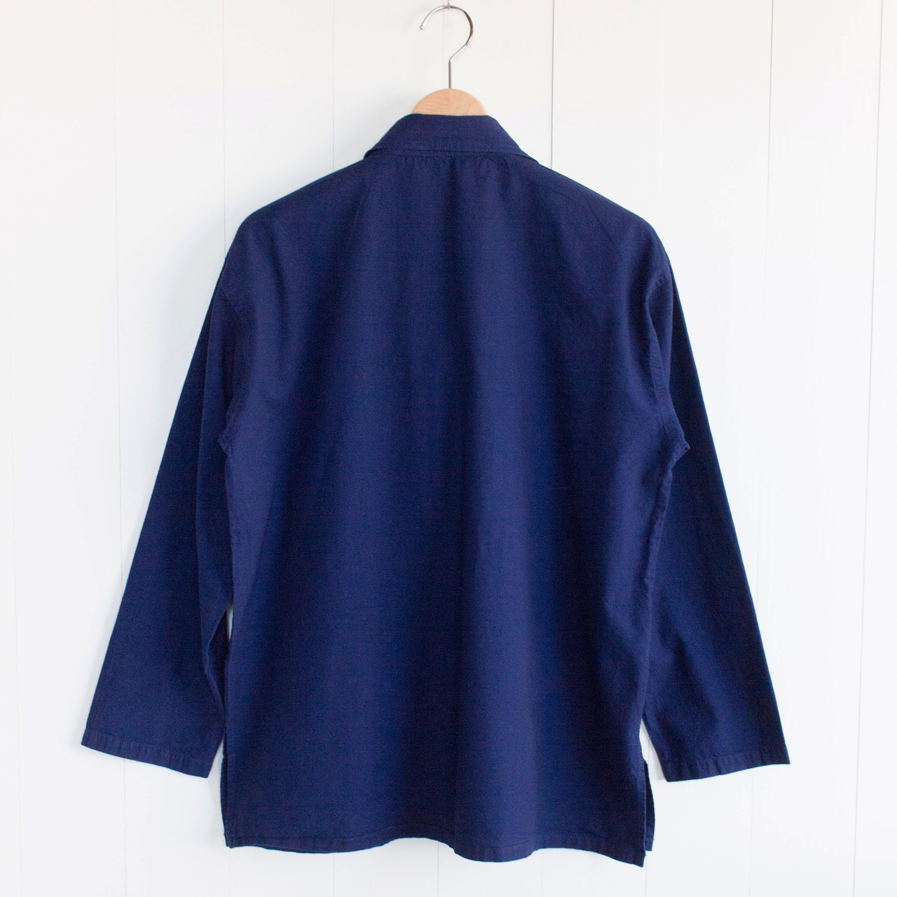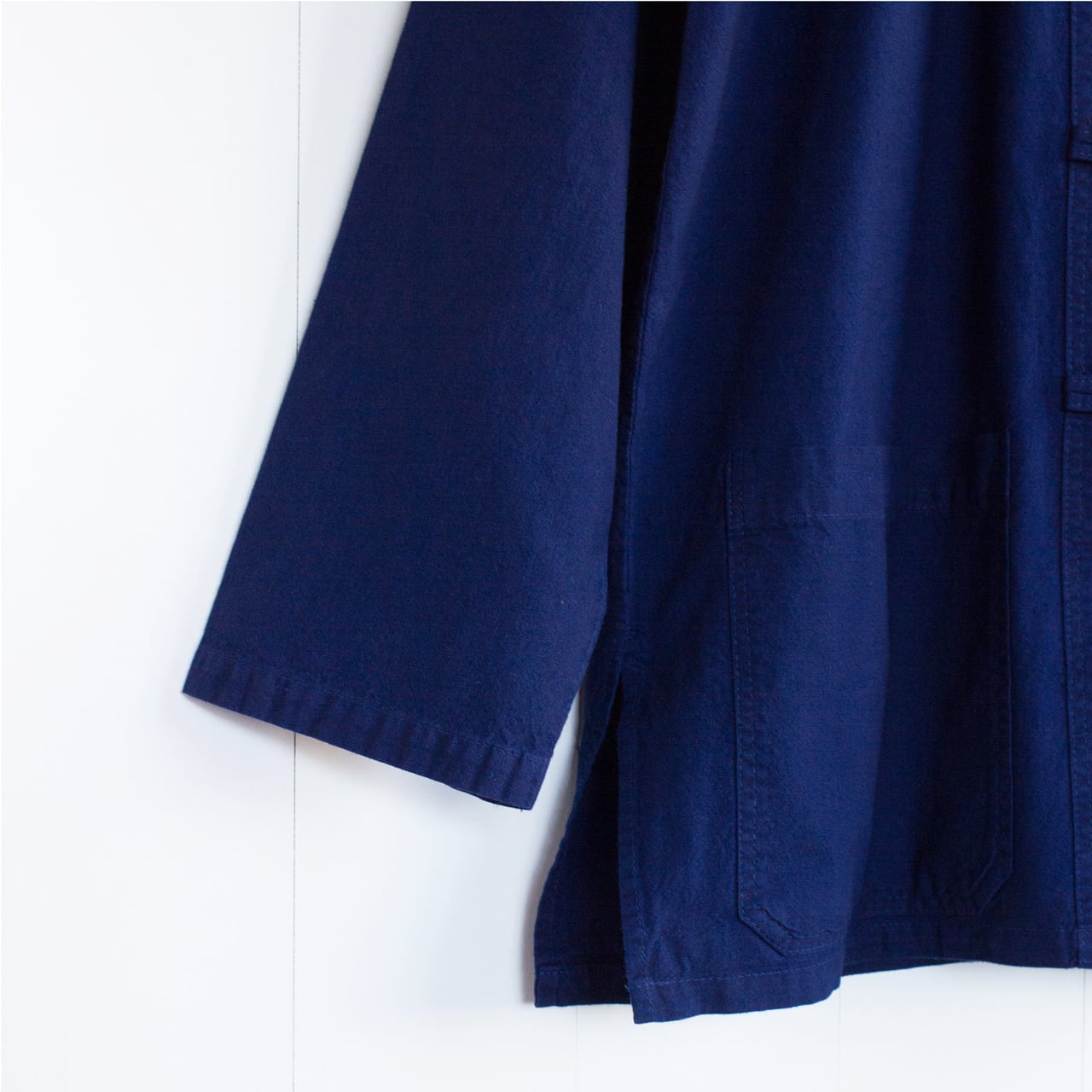 長く着込んで洗いを重ねていくと、徐々に濃藍色から淡い風合いのある藍色へ色落ちしていき味わいが増す藍染め服です。