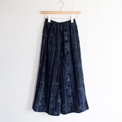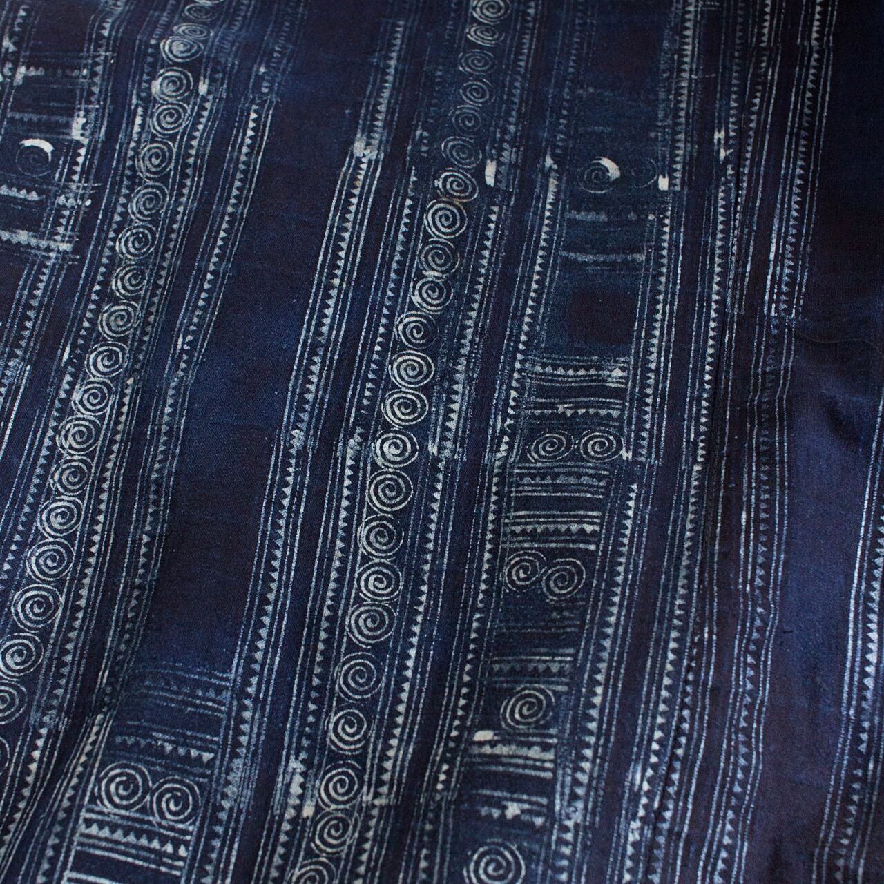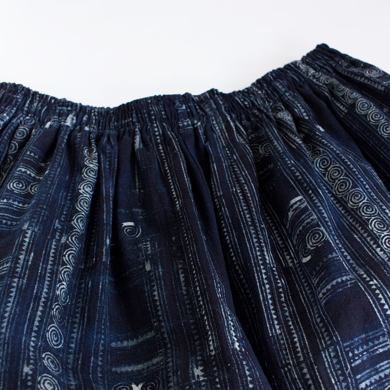モン族の藍染めろうけつ染め綿古布をリメイクしたガウチョパンツ/ワイドパンツです。太さの違う不規則なラインにぐるぐる巻き文様もいりまじってエスニックな雰囲気が漂います。濃藍にかすれた感じで浮かぶ白の模様がクールです。
